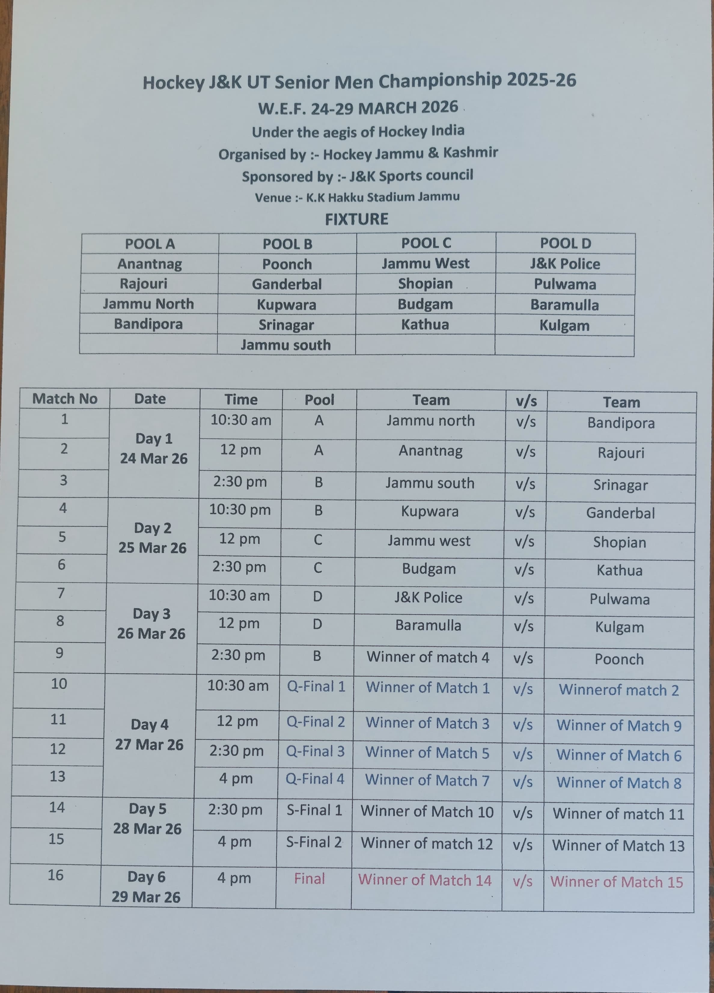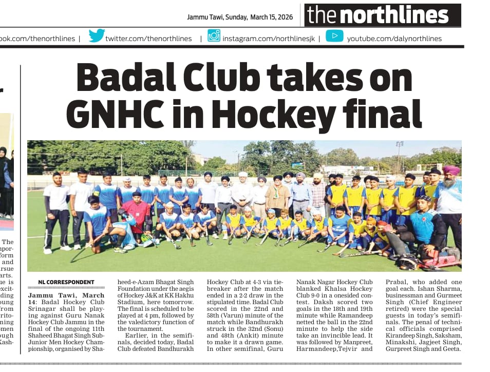 Hockey J&K UT Men Hockey Championship day 3; Quarterfinal lineup drawn. After the long period of 3 years Hockey J&K UT Men Hockey Championship begin on 24th March at KK Hakku Hockey Stadium Jammu . A total number of 17 teams are participating in this championship from all over the UT..