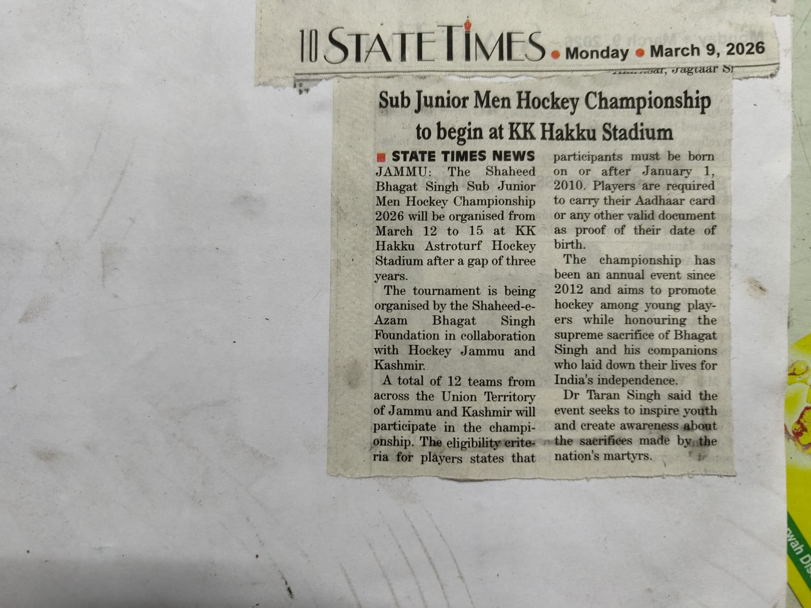 Press Note Hockey J&K UT Men Hockey Championship day 2 After the long period of 3 years Hockey J&K UT Men Hockey Champioship begins today at KK Hakku Hockey Stadium Jammu . A total numder of 17 teams are participating in this championship from all over the UT..
