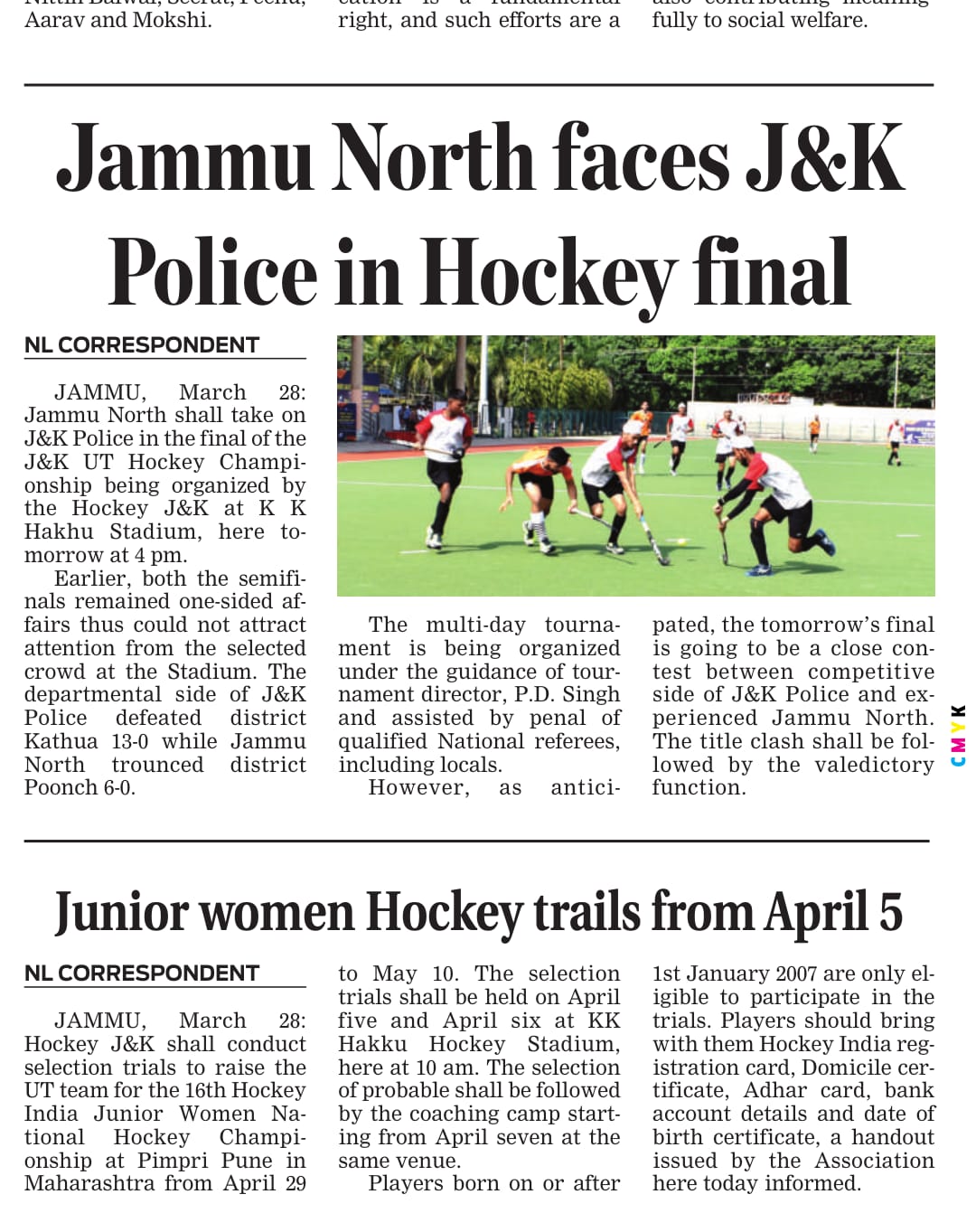 Hockey J&K UT Men Hockey Championship day 5; Jammu North and J&K Police stormed into finals.